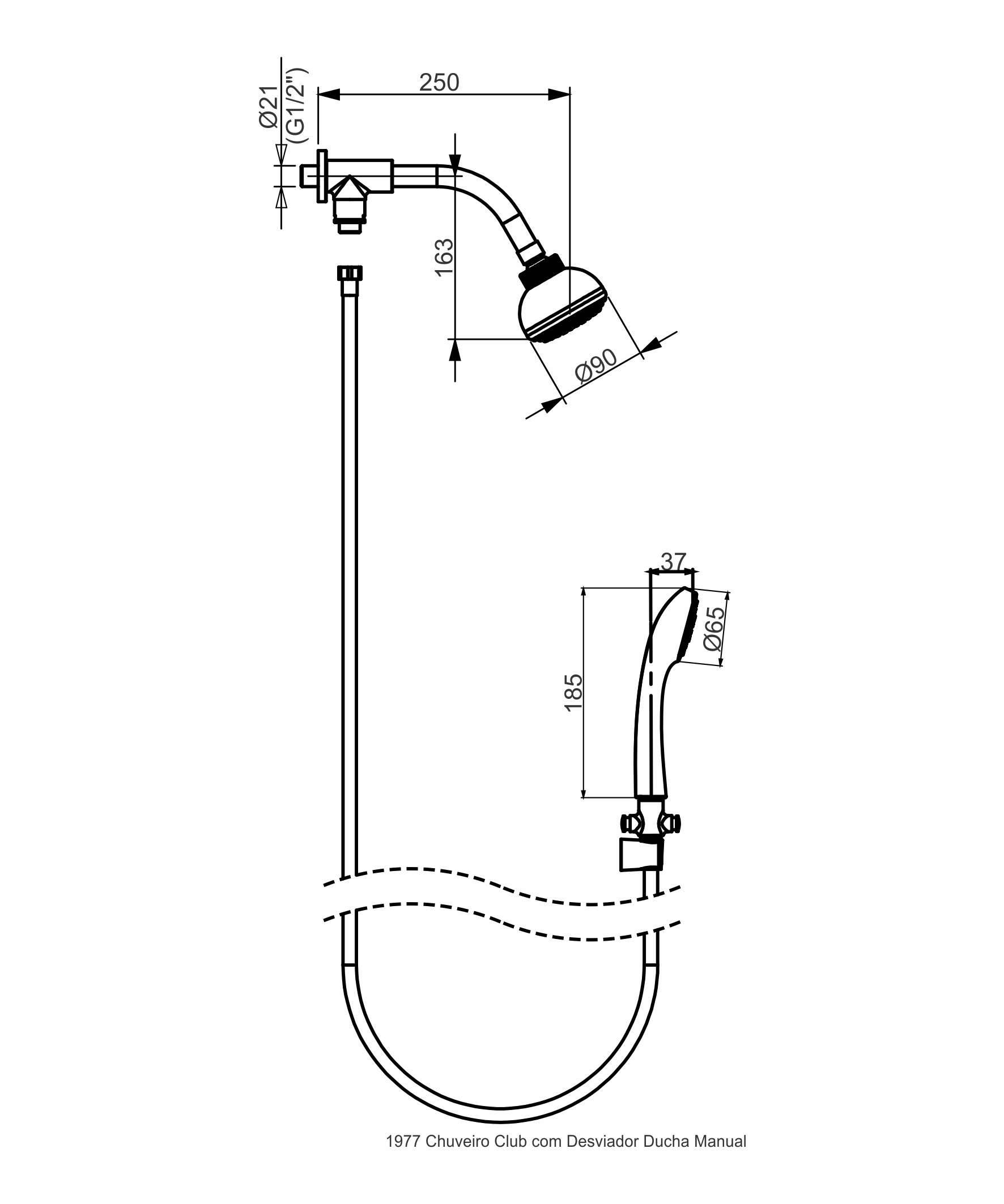 - Chuveiro Club com válvula de desvio, flexível metálico cromado de 1,75m e ducha manual com suporte de fixação.