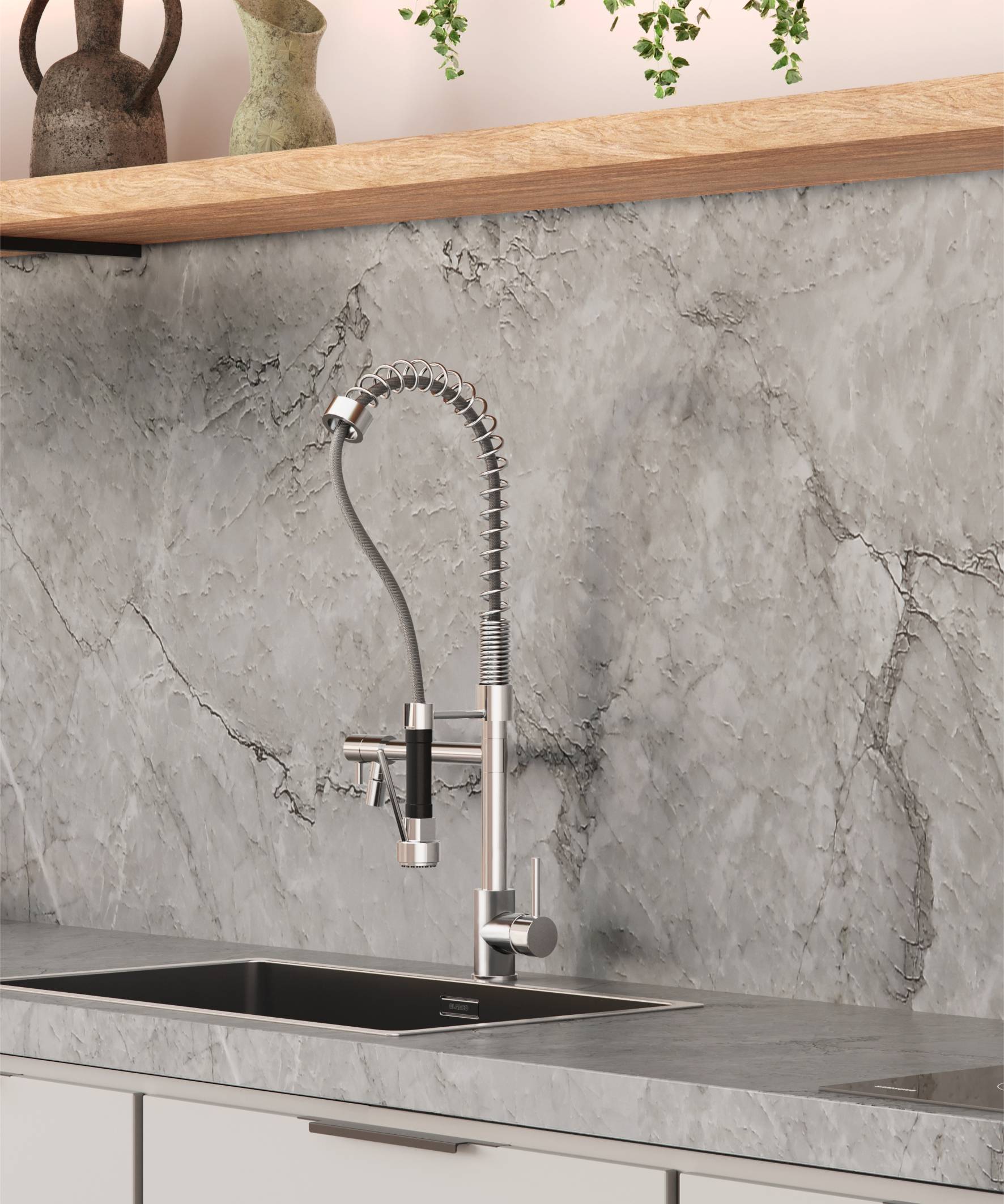 - O Misturador Monocomando Big Kitchen possui uma articulação excelente nas duas saídas de água, permitindo um alto alcance de sua base central, quando se fala do tubo flexível principal, o que possibilita ser usado em pias de duas cubas, sendo ideal para ambientes goumert