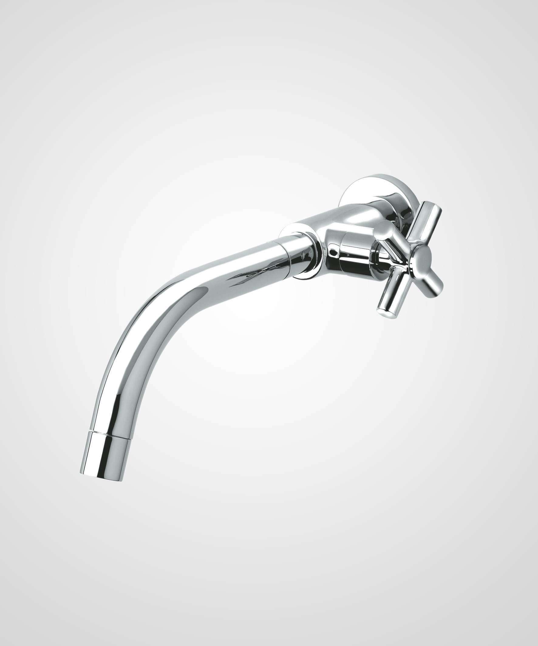 - Torneira metálica robusta, com design moderno, combinando formas circulares.